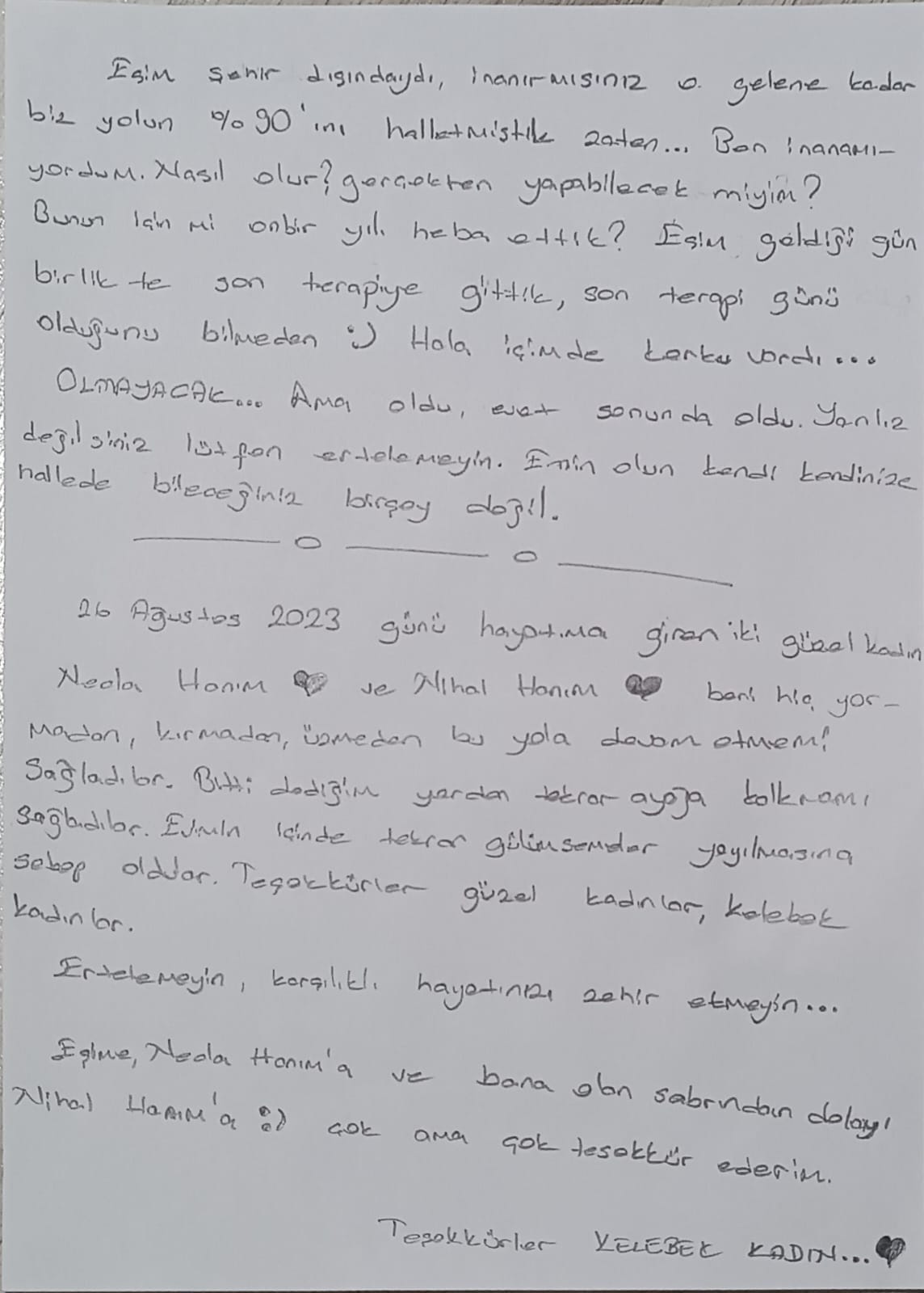 26 Ağustos 2023 günü hayatıma giren iki güzel kadın Necla Hanım❤ ve Nihal hanım❤ beni hiç yormadan, kırmadan, üzmeden bu yola devam etmemi sağladılar. Bitti dediğim yerden tekrar ayağa kalkmamı sağladılar. Evimin içinde tekrar gülümsemeler yayılmasına sebep oldular. Teşekkürler güzel kadınlar, kelebek kadınlar.