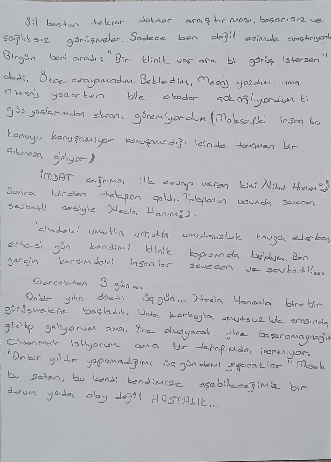 Sil baştan tekrar doktor araştırması, başarısız ve sağlıksız görüşmeler. Sadece ben değil eşim de araştırıyordu. Bir gün beni aradı:”bir klinik var ara bir görüş istersen” dedi. Önce arayamadım. Bekledim, mesaj yazdım. Ama mesaj yazarken bile o kadar çok ağlıyordum ki gözyaşlarımdan ekranı göremiyordum. (Maalesef ki insan bu konuyu konuşamıyor konuşamadığı için de tamamen bir çıkmaza giriyor)
