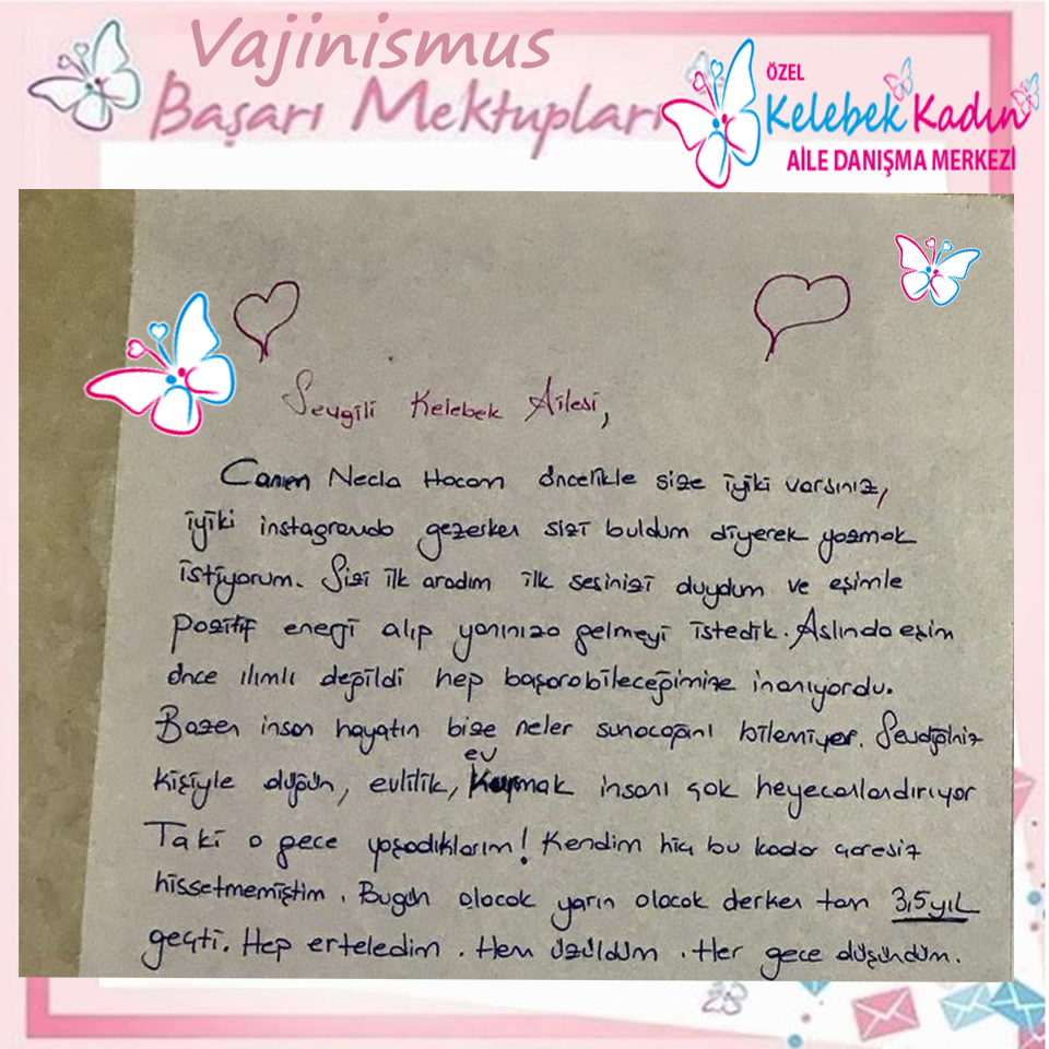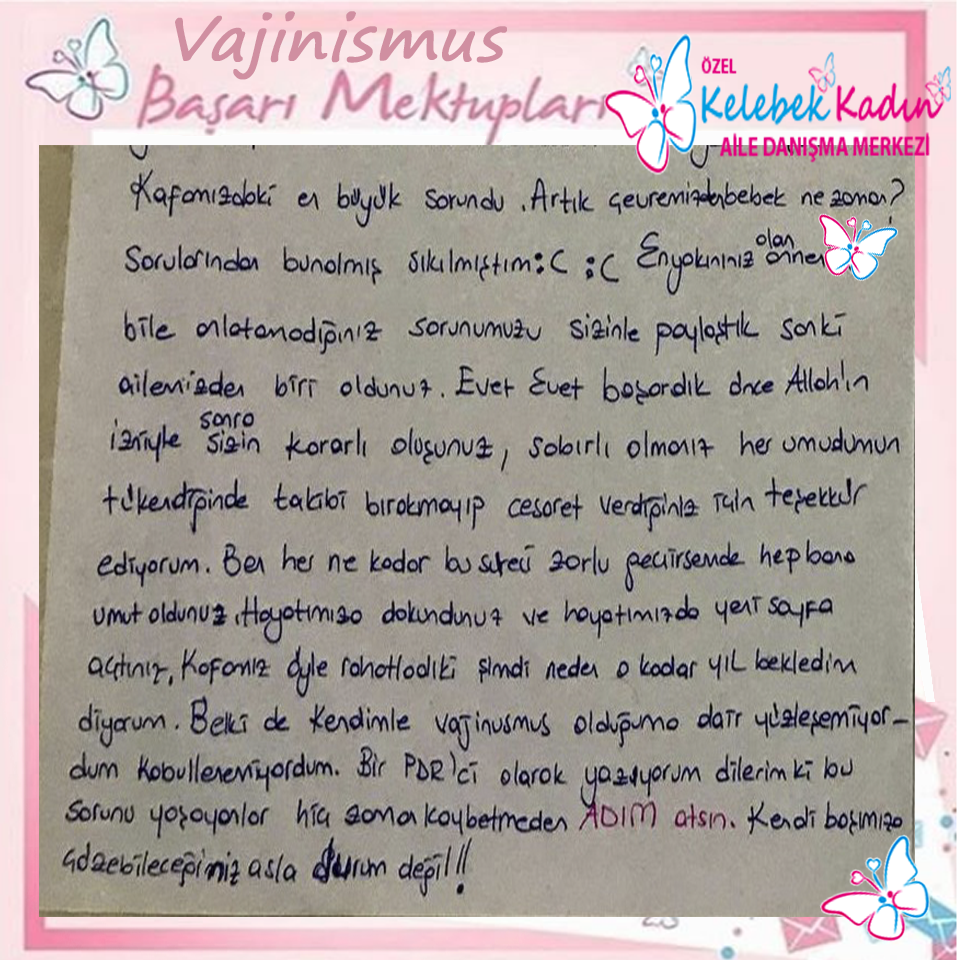 Kafamızdaki en büyük sorundu. artık çevremizden bebek ne zaman? sorularından bunalmış sıkılmıştım ?? en yakınınız olan annenize bile anlatamadığınız sorununuzu sizinle paylaştık sanki ailemizden biri oldunuz. Evet Evet başardık önce Allah’ın izniyle sonra sizin kararlı oluşunuz, sabırlı olmanız, her umudumun tükendiğinde takibi bırakmayıp cesaret verdiğiniz için teşekkür ediyorum. Ben her ne kadar bu sürece zorlu geçirsem de hep bana umut oldunuz. Hayatınıza dokundunuz ve hayatımızda yeni sayfa açtınız. Kafamız öyle rahatladı ki şimdi neden o kadar yıl bekledim diyorum. Belki de kendimle vajinismus olduğuma dair yüzleşmiyordum kabullenemiyordum. Bir PDR ci olarak yazıyorum dilerim ki bu sorunu yaşayanlar hiç zaman kaybetmeden adım atsın. Kendi başınıza çözebileceğiniz asla durum değil. Eşimle ilk gittiğimizde %100 çözüm demiştiniz ve o gün terapiden sonra hak verdik size… Yaşayıp gördükçe yüzde yüz çözüm Evet evet ?? mektupları görüp ben de yazarım inşallah diye bekledim ve o gün geldi. Ben hep önceki mektupları okuyup cesaretlendim. Şimdi de ben size UMUT olmak istiyorum hayatınızın en önemli sorununu sakın ERTELEMEYİN! Ben de Kelebek Kadın oldum. çok şükür. Siz de Kelebek olmak için sadece adım atın yeter. Necla Hocam zaten elinizden tutar. kararlı oluşu, sakinliği, cesaret verişi, güven verişi, inanılmaz güzel. İyi ki varsınız iyi ki hayatınıza dokundunuz. Sizi Seviyoruz ❤️❤️❤️