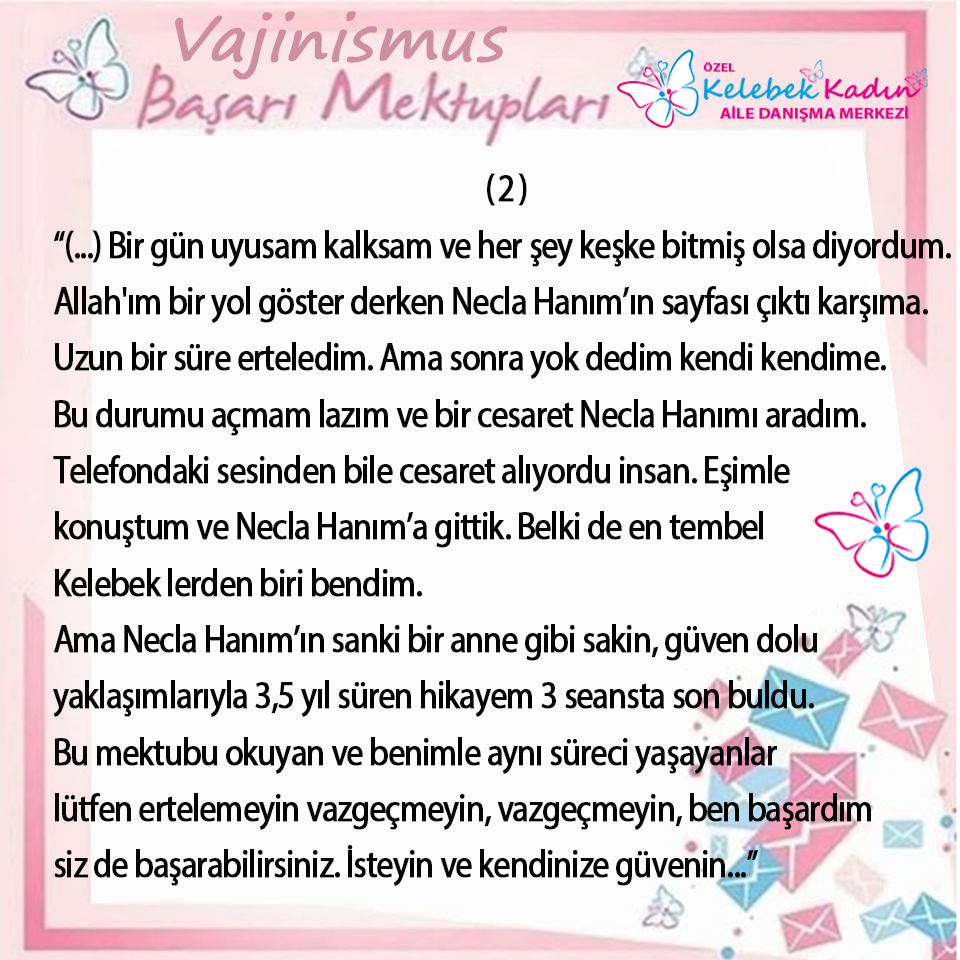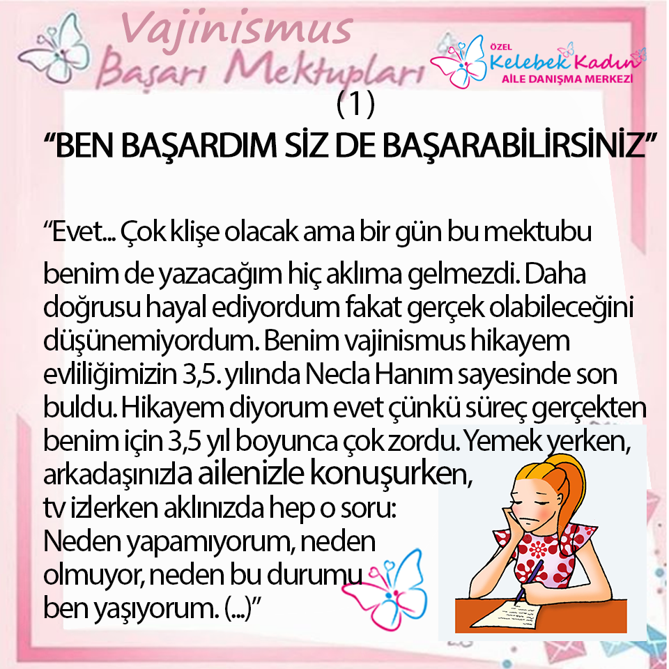 Hikayem diyorum evet çünkü süreç gerçekten benim için 3,5 yıl boyunca çok zordu. Yemek yerken, arkadaşınızla ailenizle konuşurken tv izlerken aklınızda hep o soru: Neden yapamıyorum, neden olmuyor, neden bu durumu ben yaşıyorum? Bir gün uyusam kalksam ve her şey keşke bitmiş olsa diyordum. Allah’ım bir yol göster derken Necla Hanım’ın sayfası çıktı karşıma. Uzun bir süre erteledim. Ama sonra yok dedim kendi kendime. Bu durumu aşmam lazım ve bir cesaret Necla Hanım aradım. Telefondaki sesinden bile cesaret alıyordu insan. Eşimle konuştum ve Necla Hanım’a gittik. Belki de en tembel ? Kelebeklerden biri bendim. Ama Necla Hanım’ın sanki bir anne gibi sakin, güven dolu yaklaşımlarıyla 3,5 yıl süren hikayem 3 seansta son buldu.