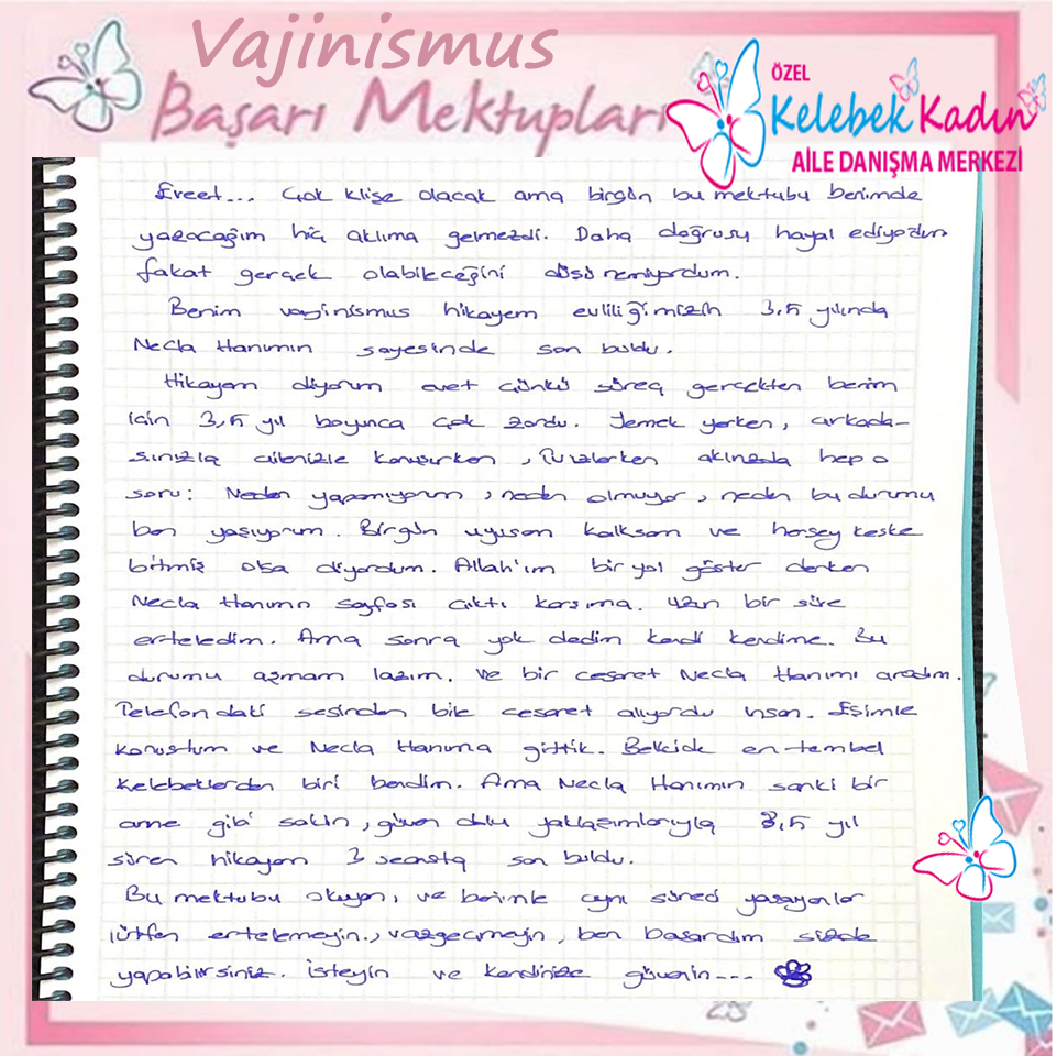 Hikayem diyorum evet çünkü süreç gerçekten benim için 3,5 yıl boyunca çok zordu. Yemek yerken, arkadaşınızla ailenizle konuşurken tv izlerken aklınızda hep o soru: Neden yapamıyorum, neden olmuyor, neden bu durumu ben yaşıyorum? Bir gün uyusam kalksam ve her şey keşke bitmiş olsa diyordum. Allah’ım bir yol göster derken Necla Hanım’ın sayfası çıktı karşıma. Uzun bir süre erteledim. Ama sonra yok dedim kendi kendime. Bu durumu aşmam lazım ve bir cesaret Necla Hanım aradım. Telefondaki sesinden bile cesaret alıyordu insan. Eşimle konuştum ve Necla Hanım’a gittik. Belki de en tembel ? Kelebeklerden biri bendim. Ama Necla Hanım’ın sanki bir anne gibi sakin, güven dolu yaklaşımlarıyla 3,5 yıl süren hikayem 3 seansta son buldu.
