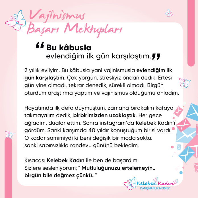 2 yıllık evliyim. Bu kâbusla yani vajinismusla evlendiğim ilk gün karşılaştım. Çok yorgun, stresliyiz ondan dedik. Ertesi gün yine olmadı, tekrar denedik, sürekli olmadı. Bir gün oturdum araştırma yaptım ve vajinismus olduğumu anladım. Hayatımda ilk defa duymuştum, zamana bırakalım kafaya takmayalım dedik, birbirimizden uzaklaştık. Her gece ağladım, dualar ettim. Sonra Instagram’da Kelebek Kadın’ı gördüm. Sanki karşımda 40 yıldır konuştuğum birisi vardı. O kadar samimiydi ki beni değişik bir moda soktu, sanki sabırsızlıkla randevu gününü bekledim.