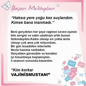 Bir gün tesadüfen internette Necla hanıma rastladım. Hemen aradım ve konuştuk. Bir insanın sesi bu kadar mı huzur verir ? Eminim ki sizlerde bunun farkına varacaksanız.Gerçekten güvendim ve kendimi iyi hissetmeye başlamıştım. 1 ay sonra randevum vardı.Sabırsızlıkla bekledim o günü ve o gün gelip çatmıştı. Ben içeri girer girmez bana öyle bir sarıldı ki inanın bütün kaygılarım sona ermişti. 3 seansın sonunda başardım. Önce rabbimin sonra ise Nacla hanımın Sabri ve çabasıyla.Ben ağır ve zor bir vajinismus hastasıydım. Başaramam demeyin denemeden bilemezsiniz.Şimdi sizlere sesleniyorum. Hayatınızı, kadınlığınızı ve en önemlisi ise anneliğinizi ertelemeyin. Ve şimdi ben bir bebek bekliyorum.Çok kısa bir süre içerisinde oldu.Gerçekten çok şükür Rabbime…