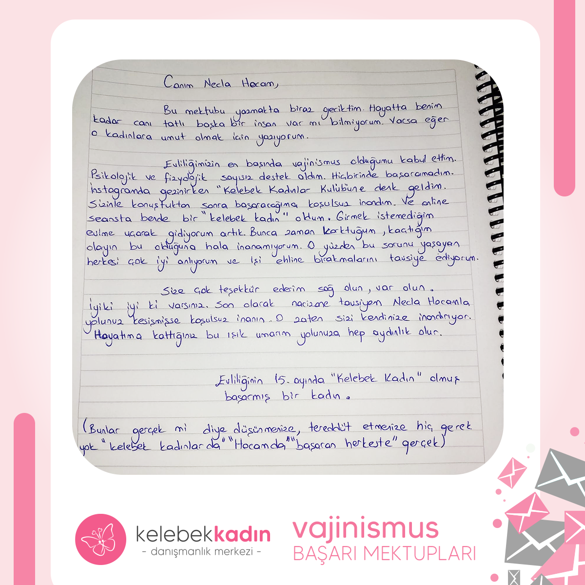 Evliliğimizin en başında vajinismus olduğumu kabul ettim. Psikolojik ve fizyolojik sayısız destek aldım. Hiçbirinde başaramadım. Instagram’da gezinirken “Kelebek Kadınlar Kulübü”ne denk geldim. Sizinle konuştuktan sonra başaracağıma koşulsuz inandım. Ve online seansta ben de bir “kelebek kadın” oldum. Girmek istemediğim evime uçarak gidiyorum artık. Bunca zaman korktuğum, kaçtığım olayın bu olduğuna hala inanamıyorum. O yüzden bu sorunu yaşayan herkesi çok iyi anlıyorum ve işi ehline bırakmalarını tavsiye ediyorum.