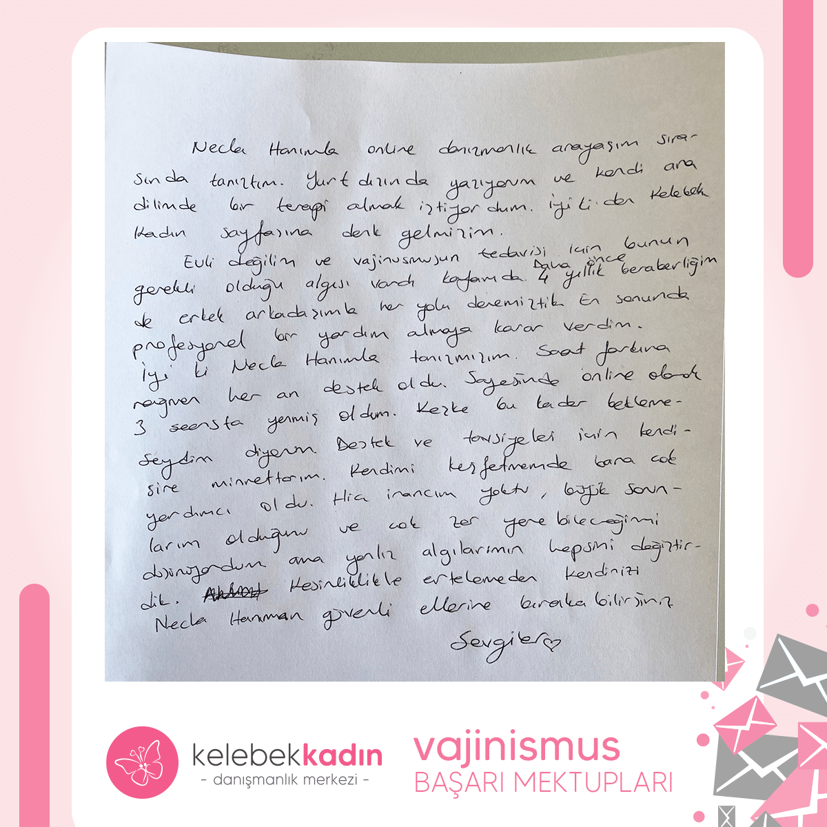 Necla hanımla online danışmanlık arayışım sırasında tanıştım. Yurt dışından yazıyorum ve kendi ana dilimde Bir terapi almak istiyordum. İyi ki de Kelebek Kadın sayfasına denk gelmişim.